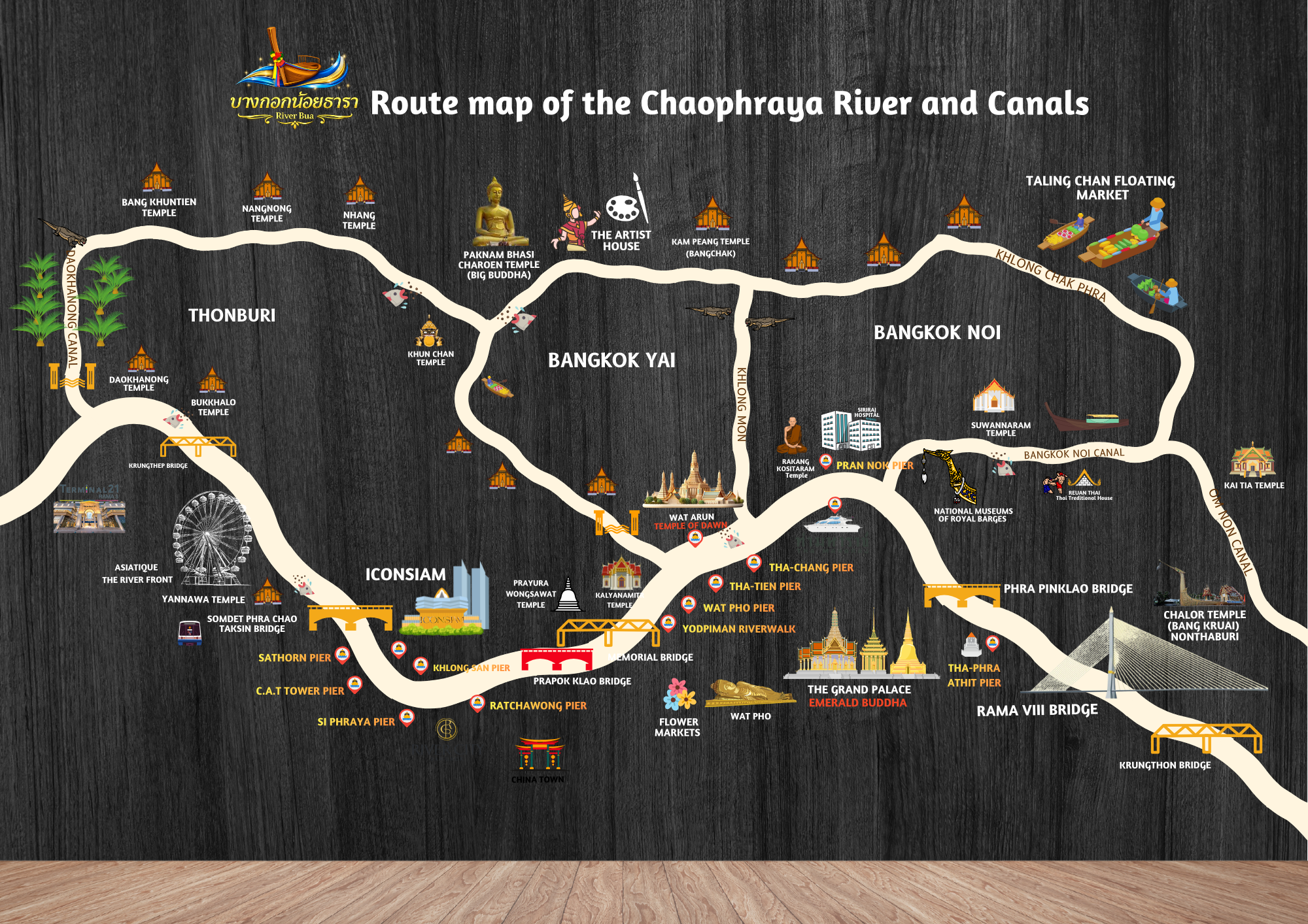 The current flows north through many historical and cultural landmarks, such as National Museum of Royal Barges, Wat Suwannaram, Wat Amarintharam, and Wat Si Sudaram. The canal terminates at the confluence with Khlong Om Non and Khlong Bang Yai at the Old Bang Yai Market, along the way, it is also connected to many canals. For this reason it has been promoted as one of the cultural tourism routes.